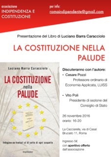 Per chi è a Roma, o può raggiungere Roma, sabato prossimo, con Cesare Pozzi e Vito Poli, discuteremo della Costituzione partendo da "La Costituzione nella palude". Quindi, partendo dall'€uropa per arrivare ai nostri giorni: gli effetti di desertificazione sociale, demografica e industriale, e infine "istituzionale", del "vincolo esterno".
