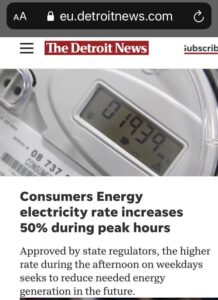 Carenze si accompagna a rincari. In questo si segnala lo Stato del Michigan, che per lo scopo nobilissimo di ridurre il CO2, e contribuire alla de carbonizzazione, ha dato il via ad un aumento del 50% – dicesi 50 per cento – dell’elettricità nelle ore di punta al milione e mezzo di utenti della Consumers ENErgy: in ciò imitando stranamente le direttive della Unione Europea, che penalizza l’emissione di combustibile da riscaldamento e trasporto in modo esoso, onde ridurne l’uso.