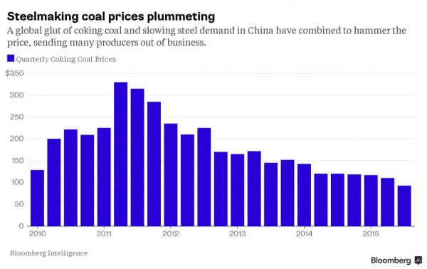 Nel caso di Alpha Natural Resources, ad esempio, la domanda artificiale ha riguardato il carbone. E la tendenza di prezzo mostrata di seguito non è affatto sorprendente alla luce di quello che è successo alla capacità d’acciaio in Cina.