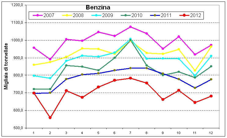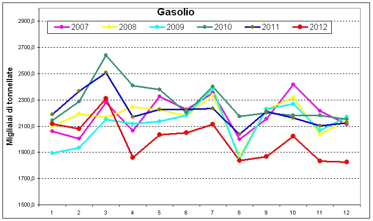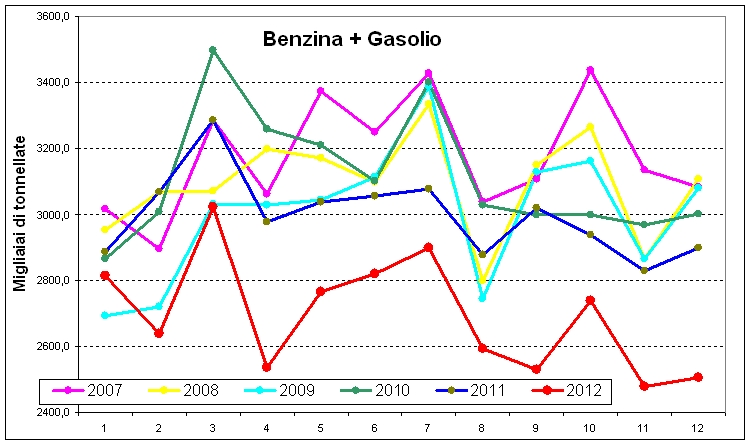 Nel 2012 la somma dei soli carburanti (benzina + gasolio), evidenzia un peggioramento del 10,5% (-3.674.000 tonnellate).