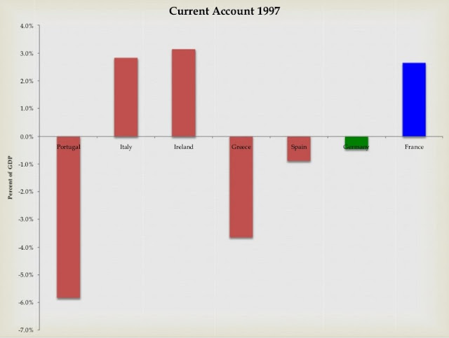 Esaminiamo ora i rapporti di forza fra la Germania ed il resto dell' Eurozona, partendo dal 1997 e confrontandoli con il presente: