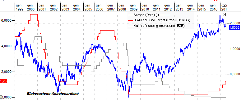 Nel grafico è stato riportato l'andamento dello spread (linea blu, scala destra) tra il rendimento del decennale Usa e quello tedesco. Le linee più sottili che osservate fanno riferimento ai tassi delle due banche centrali: la Federal Reserve (linea rossa, scala sinistra) e la BCE (linea grigia, scala sinistra).
