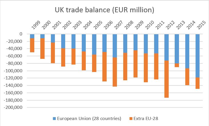 E allora parliamo di Brexit, facendo finta che valga la pena di parlarne. Il dato che molti hanno messo in evidenza, e che qui vorrei elaborare un minimo con voi, è che la minaccia di ritorsioni nei riguardi del Regno Unito non ha alcun senso, per il semplice motivo che è il Regno Unito, strutturalmente, a sostenere con la sua domanda di beni il resto dell'Unione Europea, e non il contrario. In effetti, il Regno Unito è un importatore netto di beni del resto del mondo, Unione Europea compresa, il che significa, d'altro canto, che l'Unione Europea nel suo complesso è una esportatrice netta di beni nei riguardi del Regno Unito.