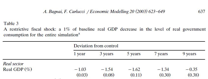 Naturalmente questi calcoli sono meramente indicativi, per diversi motivi, uno dei quali è che nelle stime del nostro modello consideravamo l'Unione Europea compreso il Regno Unito: può darsi benissimo che la risposta dell'Unione Europea senza Regno Unito sia lievemente diversa (ma che il moltiplicatore keynesiano sia un po' dappertutto pari a circa 1,5 mi pare stia emergendo dalla letteratura, ed è quello che in fondo tutti sapevano, tranne chi aveva interesse a ignorarlo, perché da buon garzone di bottega doveva riscuotere i sospesi, come abbiamo dettagliato
