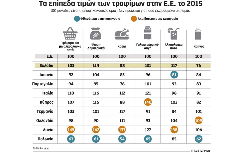 Pertanto secondo i dati Eurostat, i prezzi dei prodotti alimentari e bevande alcoliche è superiore in Grecia rispetto alla media UE del 3%. Il latte e le uova sono più costosi del 31% della media comunitaria, rendendo la Grecia il secondo paese più caro dopo Cipro tra i "28" in questa categoria di prodotto. La Grecia è il 17% più costoso rispetto alla media UE e il sesto più costoso tra i "28" nella categoria di bevande alcoliche, uno sviluppo che in modo significativo a causa di un eccesso di tassazione di questi prodotti.