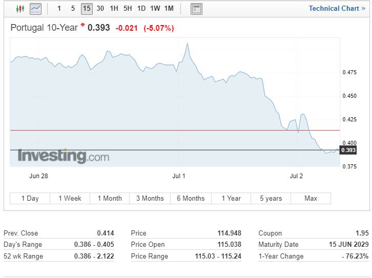 Il rendimento portoghese a 10 anni è dello 0,386% in calo del 6,8%, mentre il rendimento dei titoli spagnoli a 10 anni raggiunge lo 0,317% con un calo del 5,7%.