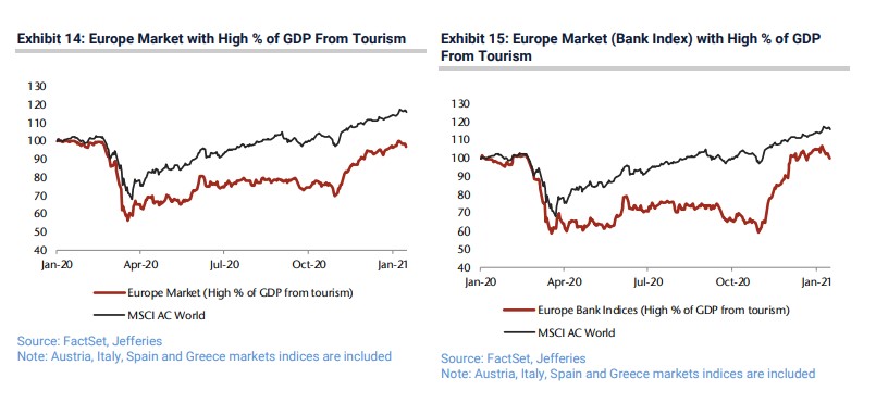 Secondo Jefferies, si prevede che le economie in cui il turismo è un'industria chiave e detiene una quota significativa del PIL trarranno il massimo sollievo dalla vaccinazione di una parte crescente della popolazione. E la cosa molto interessante è che in questi paesi i settori bancari hanno sottoperformato in modo significativo rispetto al mercato azionario interno totale negli ultimi 12 mesi.