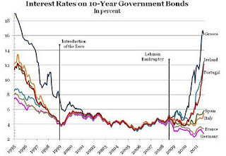 Quindi i trattati europei, con l’aggiornamento avvenuto a partire dal 1° dicembre 2009, specificano che è possibile in via eccezionale un recesso dall’Unione Europea, anche se non menzionano mai l’eventualità di un’uscita dalla moneta unica. Tuttavia è chiaro che le due cose vanno assolutamente di pari passo e nel caso di ostruzionismi vari da parte delle istituzioni europee, i paesi membri intenzionati ad uscire dall’eurozona potrebbero appellarsi alla convenzione di Vienna del 1969 sui trattati internazionali, dato che per esempio la BCE dopo l’inizio della crisi nel 2008 non ha più rispettato gli accordi e non ha assolto alla sua funzione di strumento di convergenza dei tassi di interessi con cui si finanziano i vari paesi europei (anzi, come purtroppo abbiamo appurato, i tassi di interesse sono letteralmente esplosi, se confrontiamo il 22% della Grecia, il 7% della Spagna, il 6% dell’Italia contro l’1,5% della Germania, guarda grafico sotto), come esplicitamente riportato sui Trattati di Funzionamento dell’Unione Europea. In questo caso uscendo contemporaneamente sia dall’eurozona che dall’Unione Europea, l’Italia potrebbe agire ad ampio raggio sul controllo dei movimenti dei capitali (la cui liberalizzazione sfrenata è stata senza ombra di dubbio la causa principale della crisi finanziaria globale) e le sue operazioni di stabilizzazione del cambio sarebbero molto efficaci dato che la nuova lira avrebbe inizialmente pochi scambi al di fuori dell’Italia, come avviene per esempio con altre monete molto più quotate e scambiate a livello internazionale come il dollaro e il franco svizzero, i cui rispettivi tassi di cambio vengono decisi principalmente fuori dai confini degli Stati Uniti e della Svizzera.