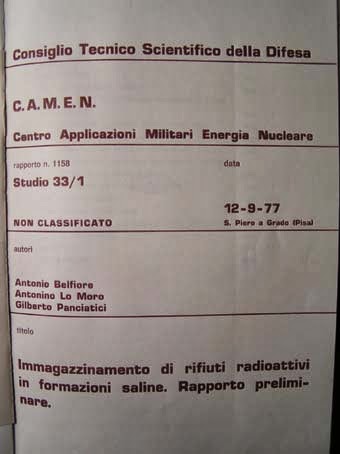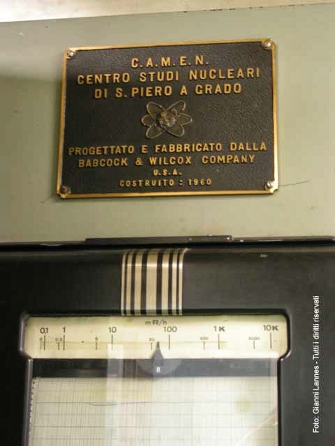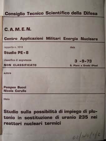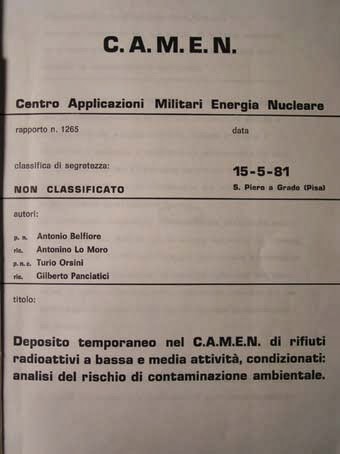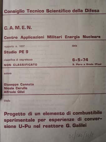 San Piero a Grado (PI): centrale nucleare militare - foto Gianni Lannes (tutti i diritti riservati) [FONT="]Il Rapporto 1010 (3 settembre 1973) del Camen è eloquente: “Studio sulla possibilità di impiego di plutonio in sostituzione di uranio 235 nei reattori nucleari termici”. Alla stregua del rapporto 1037 (6 maggio 1974) “Progetto di un elemento di combustibile sperimentale per esperienza di conversione Uranio-Plutonio nel reattore G. Galilei”; e del rapporto 1041 (21 agosto 1974) intitolato “Impianto di laboratorio per il ritrattamento di uranio irraggiato”. Ed ancora del rapporto 1154 (2 settembre 1977), denominato “Progetto di impianto di produzione di esafluoruro di uranio” e del rapporto 1158 (12 settembre 1977), intitolato “Immagazzinamento di rifiuti radioattivi in formazioni saline”. «Ci siamo sempre occupati della sorveglianza fisica per vari enti del ministero della Difesa - mi ha spiegato Francesco Andreuccetti, direttore del Centro - del servizio di dosimetria per tutte le forze armate, della gestione della catena di controllo ambientale e della raccolta, condizionamento e conservazione di rifiuti radioattivi provenienti dalla Difesa». [/FONT]