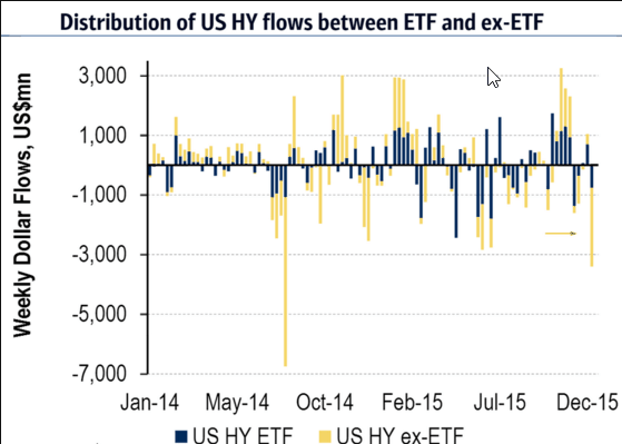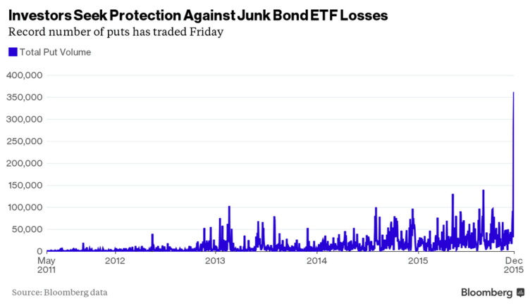 Era dall’estate del 2014 che non si vedeva in UNA settimana un aumento così consistente dei flussi finanziari in uscita. Ma non per colpa degli ETF ma per qualcosa di diverso. Che sarà successo? Sembra che ci sia un colpevole, un fondo che addirittura è stato chiuso in fretta e furia, dopo aver perso circa il 30% da fine giugno. Si tratta del Third Avenue Focused Credit Fund. Un fondo che aveva un taglio troppo aggressivo e con una concentrazione elevata di singole società. Quindi un fondo tra i più rischiosi in un settore già di per se rischioso e che oggi è in forte difficoltà. Basta buttare un occhio al “rovescio della medaglia”. Guardate come sono drammaticamente decollate le coperture sugli HY.