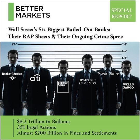 "Ci sono quattro parole in questo eccezionale rapporto di Better Markets che lo hanno reso sgradevole ai media aziendali: "fedina penale" e "impresa criminale". Abbiamo cercato nel Bloomberg News, nel Wall Street Journal e nel New York Times fino al 2004 per vedere se in qualche momento avevano usato le parole 'fedina penale' per descrivere le ondate di crimini seriali senza precedenti di queste mega banche di Wall Street. Non l'hanno fatto".