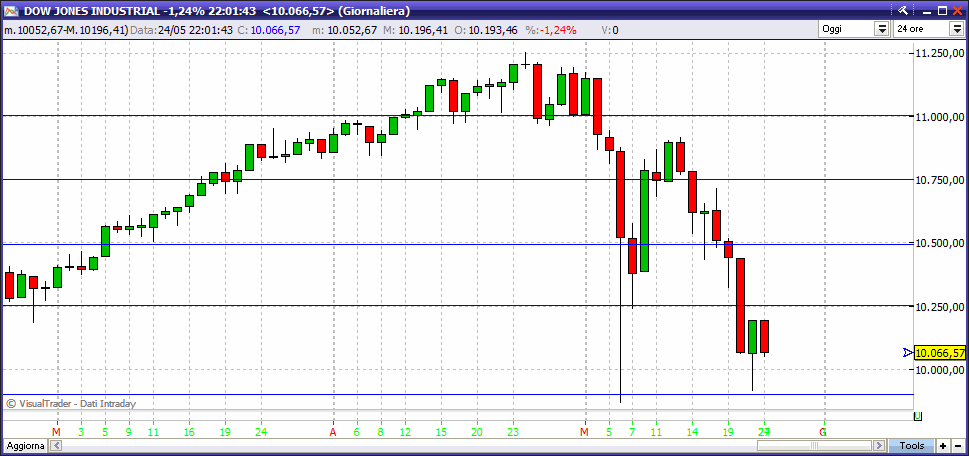 Le probabili alternative sono, vista anche l'enorme volatilità (che, peraltro, sconsiglierebbe di intraprendere operazioni sul mercato), il retest della quota 9900 ovvero la risalita verso quota 10250, zona di non indifferente resistenza, che potrebbe persino vedere (non l'auspicato ritorno in area 10500 ma) l'esaurimento delle ambizioni rialziste per andare dritti dritti alla predetta quota 9900.