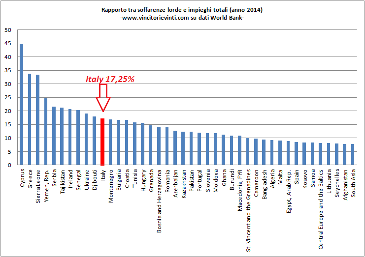 I dati sono della Wordl Bank e si riferiscono a fine 2014. Poiché la World Bank riporta i dati di tutti i paesi (o quasi), per rendere il grafico più intuibile mi sono limitato a considerare tutti quei paesi che hanno un rapporto superiore al 7%. Sono perfettamente consapevole che le modalità di contabilizzazione delle sofferenze potrebbero non essere uniformi nei paesi considerati, ma il grafico offre comunque uno spaccato abbastanza significativo.