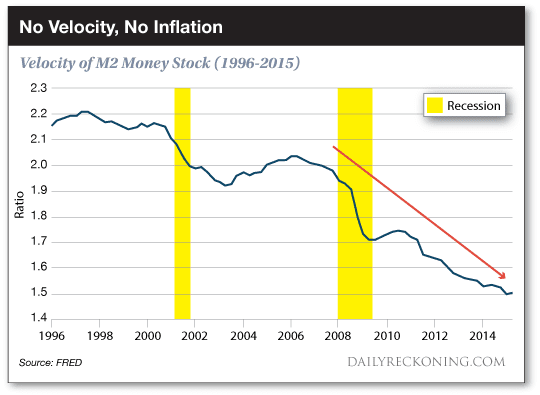 Il secondo grafico, prendendo in considerazione lo stesso lasso di tempo, mostra un calo della velocità. Infatti la stampa di denaro dal 2008 al 2015 è stata annullata dal suddetto calo della velocità. Il risultato è stato praticamente un’assenza d’inflazione (dei prezzi, NdT).