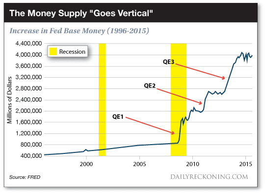 A partire dal 2008, l’offerta di moneta “è schizzata in alto” dopo tre quantitative easing (QE). Sono evidenziati come QE1, QE2 e QE3.