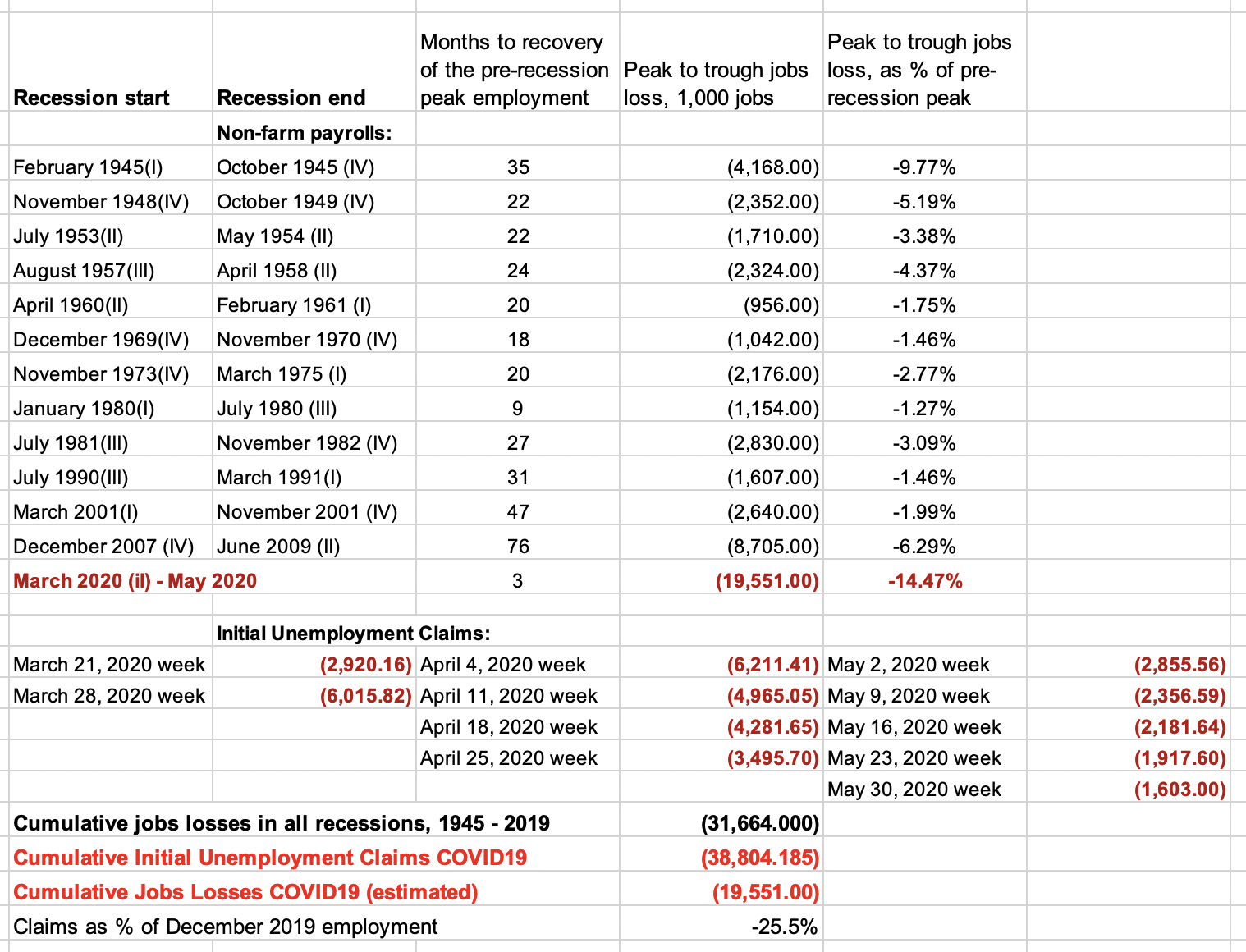 Quindi, sì, giusto, "tremendo" o, in altri termini, abbiamo distrutto 20 posti di lavoro. L'aumento dei salari non agricoli di 2.509.000 è una buona cosa alla fine di maggio, ma i nuovi aumenti medi settimanali delle richieste di disoccupazione dal 14 marzo al 30 maggio ammontano attualmente a 3.527.650. Ciò significa che i guadagni "enormi" sono solo il 71% delle perdite medie settimanali.