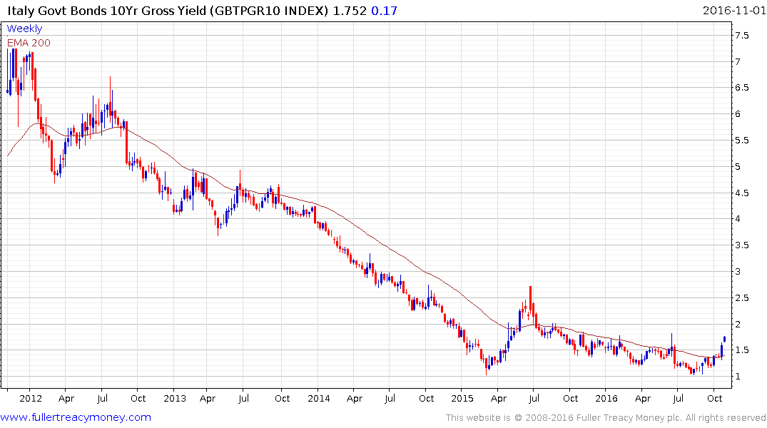 Italian government bond yields broke emphatically above the trend mean last week and have increased again today. A resumption of ECB buying will be required to stem the slide in prices as a poll today suggests Italy is now viewed as more likely to leave the EU than Greece.