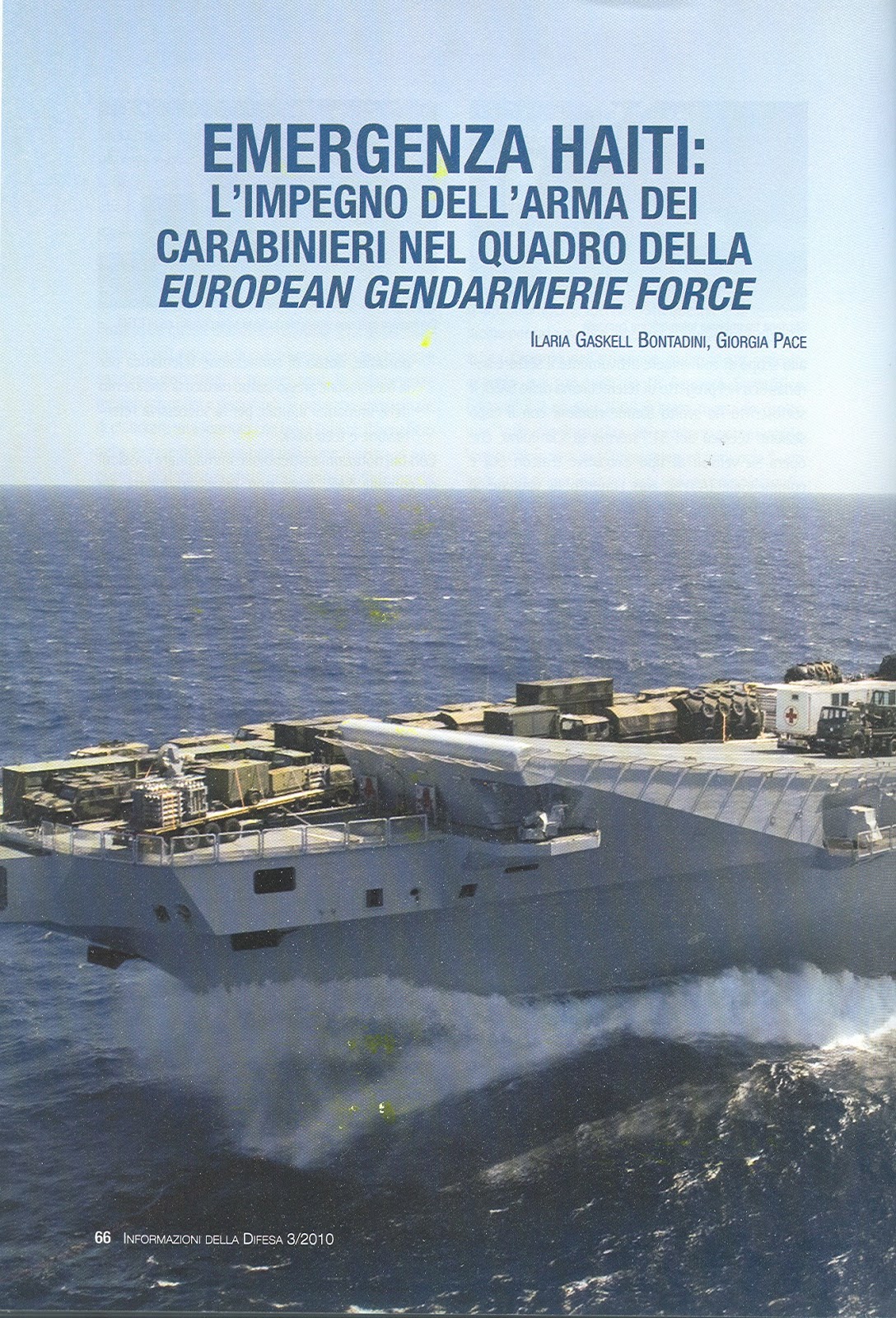 La rivista INFORMAZIONI DELLA DIFESA (periodico dello Stato maggiore della Difesa), numero 3, anno 2010. Proprio in quel numero del bimestrale ufficiale appare un articolo intitolato Emergenza Haiti: l’impegno dell’arma dei Carabinieri nel quadro della European Gendarmerie Force, a firma di Ilaria Gaskell Bontadini e Giorgia Pace.
