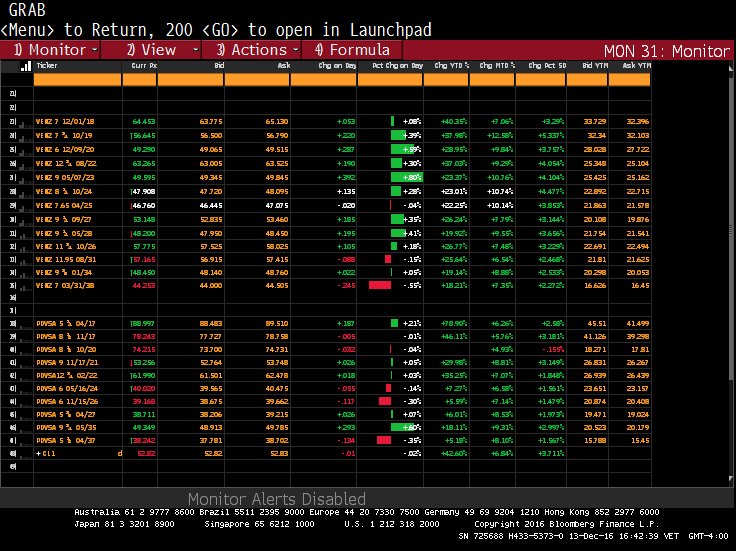 VENEZUELA - The government and state oil firm PDVSA have resolutely serviced debt, though PDVSA recently swapped $2.8 billion in bonds and resorted to a grace period for a coupon on 2035 bonds. Brokerage Exotix calculates that about $10 billion is due next year in bonds, loans and interest but expects the country to muddle through 2017. However, with food shortages and triple-digit inflation it is unclear how long the government can cling to power. BlueBay's Stock said he had cut his overweight position: "We think we are getting closer to the end of the road for these payments."