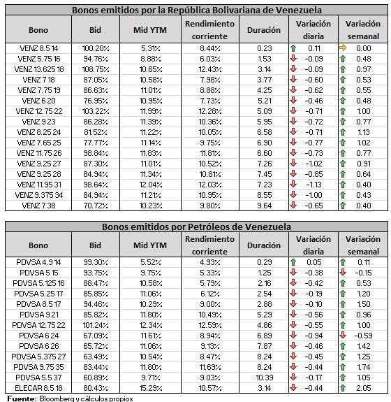 De manera más acentuada, los precios de los bonos Pdvsa 2021 y Pdvsa 2022 retrocedieron 0,55 puntos en promedio, destacando el Pdvsa 2024 con la caída más elevada de toda la curva (0,90 puntos), cotizándose en niveles similares a los de finales de junio (67%).