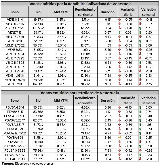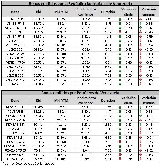11/08/2014 04:54:00 p.m. | Emen.- Deuda externa soberana y de Pdvsa culminan con pocos cambios respecto a la apertura. Sus precios conservan ligera tendencia al alza, subiendo en promedio 0,20 y 0,15 puntos respectivamente.
