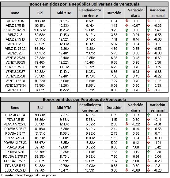 * Con un vencimiento mayor, los bonos Pdvsa 2026 y Pdvsa 2035 finalizan la semana con recuperaciones de 0,80 y 0,50 puntos respectivamente, tendencia que acentuaron en las jornadas recientes.