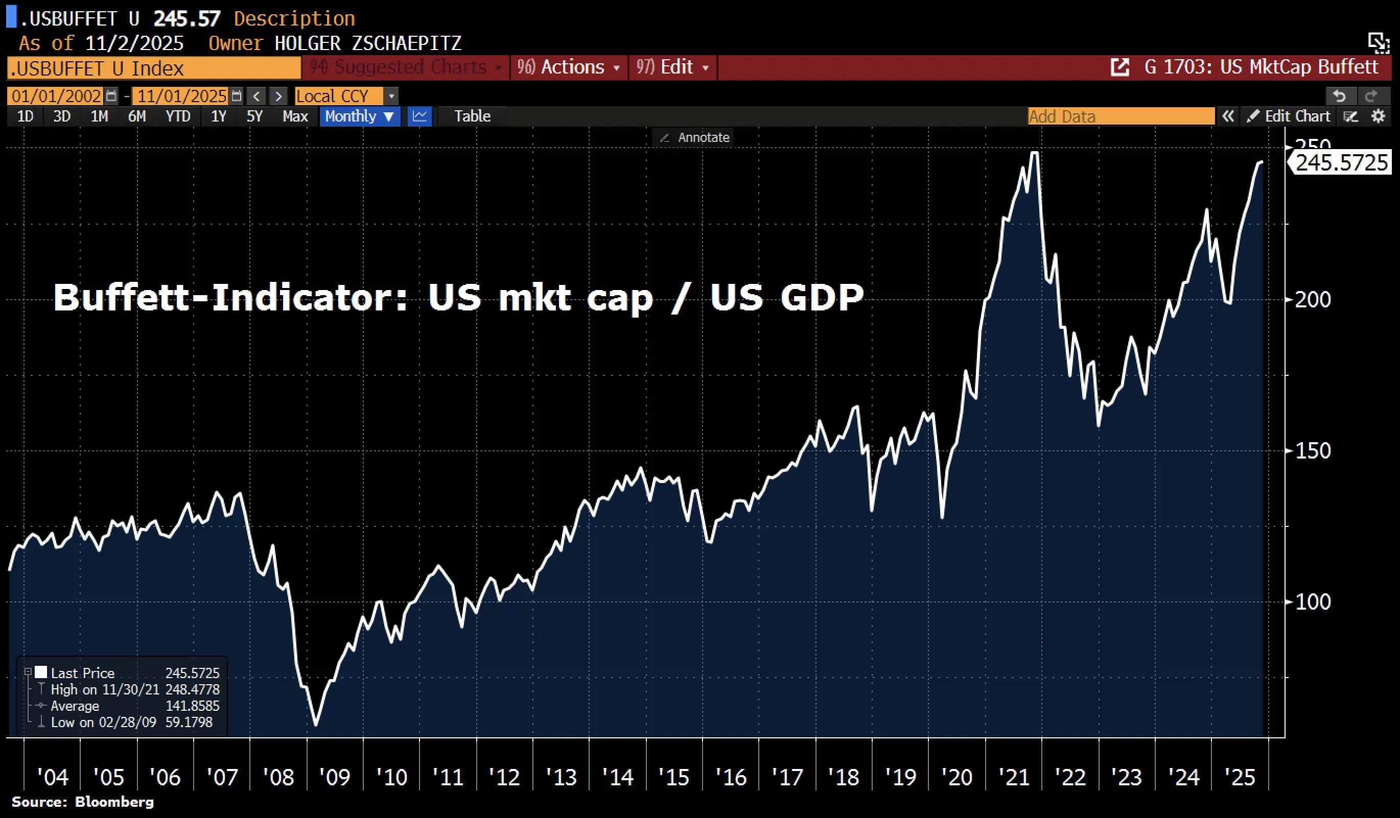 Se il mercato obbligazionario mostra segni di “euforia da rendimento”, quello azionario sembra vivere in una realtà parallela. Basta guardare due indicatori storicamente molto affidabili.1. Il Buffett Indicator Il famoso rapporto tra la capitalizzazione totale del mercato azionario statunitense e il PIL del paese. Come si vede dal grafico, abbiamo appena toccato il 245%.