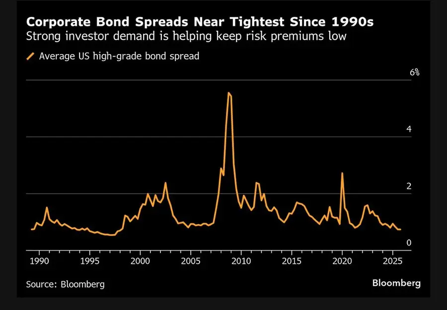 Prendiamo il caso recente dell’emissione obbligazionaria di Meta. A fronte di un’offerta (già ampia) di 30 miliardi di dollari, la domanda ha raggiunto l’iperbolica cifra di 125 miliardi. Questo appetito non è isolato. Come mostra il grafico di Bloomberg, gli spread sui titoli obbligazionari investment grade (cioè quelli considerati relativamente sicuri) sono ai minimi dagli anni ’90.