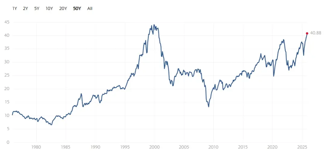 Questo indicatore paragona il valore totale di tutte le azioni (la Borsa) all’economia reale (il PIL). Un rapporto del 100% suggerisce che il mercato azionario è valutato in linea con ciò che l’economia produce. Un livello del 245% implica che le valutazioni azionarie sono quasi due volte e mezzo più grandi dell’economia sottostante. Storicamente, livelli così estremi sono insostenibili nel lungo termine e spesso precedono forti correzioni, poiché i prezzi delle azioni si sono scollegati dai fondamentali economici.